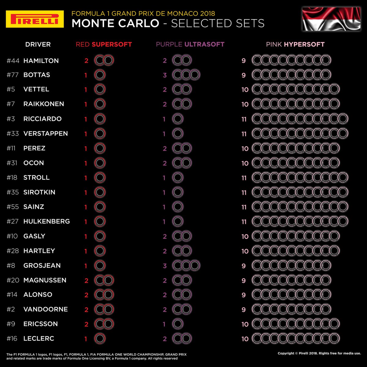 Ora, in vista della gara, c’è da considerare che la nuova mescola Hyper-Soft è quella meno conosciuta della gamma ma sul budello del principato si prevede per tutti una sola sosta, come quasi da tradizione. Farne in più rappresenterebbe un serio rischio per i motivi di cui sopra, riconducibili alla perdita di ritmo gara.
