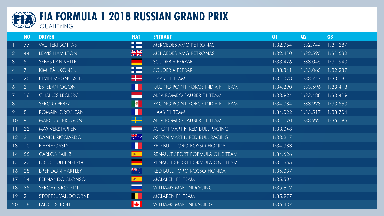 Il risultato delle qualifiche del GP di Russia a Sochi: